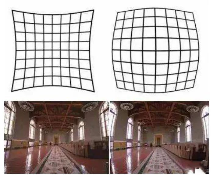 徑向畸變就是沿著透鏡半徑方向分布的畸變,產(chǎn)生原因是光線在遠離透鏡中心的地方比靠近中心的地方更加彎曲,徑向畸變主要包括桶形畸變和枕形畸變兩種。以下分別是枕形和桶形畸變示意圖。