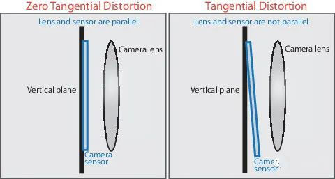 切向畸變是由于透鏡本身與圖像平面不平行而產(chǎn)生的,這種情況多是由于透鏡被粘貼到鏡頭模組上的安裝偏差導致。