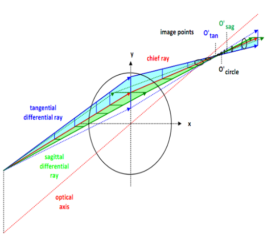 像散:由位于主軸外的某一軸外物點(diǎn),向光學(xué)系統(tǒng)發(fā)出的斜射單色圓錐形光束,經(jīng)該光學(xué)系列折射后,不能結(jié)成一個(gè)清晰像點(diǎn),而只能結(jié)成一彌散光斑,則此光學(xué)系統(tǒng)的成像誤差稱為像散。