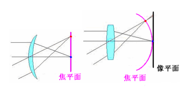 場曲:垂直于主軸的平面物體經(jīng)光學(xué)系統(tǒng)所結(jié)成的清晰影像,若不在一垂直 于主軸的像平面內(nèi),而在一以主軸為對稱的彎曲表面上,即最佳像面為一曲面,則此光學(xué)系統(tǒng)的 成像誤差稱為場曲。