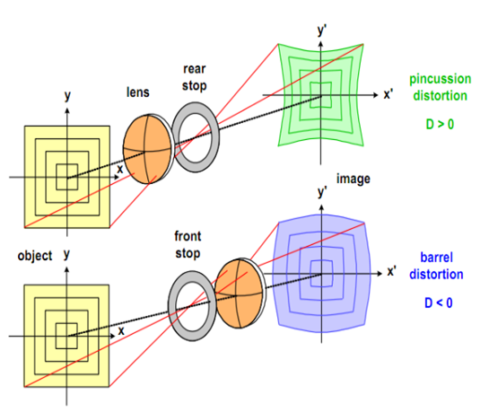 色差:由白色物體向光學(xué)系統(tǒng)發(fā)出一束白光,經(jīng)光學(xué)系統(tǒng)折射后,各色光不能會(huì)聚于一點(diǎn)上,而形成一彩色像斑,稱為色差。畸變:被拍平面內(nèi)的主軸外直線,經(jīng)光學(xué)系統(tǒng)成像后變?yōu)榍€,則此光學(xué)系統(tǒng)的成像誤差稱為畸變。
