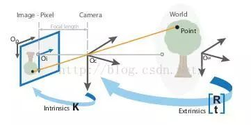 在opencv的3D重建中(opencv中文網(wǎng)站中:照相機(jī)定標(biāo)與三維場(chǎng)景重建),對(duì)攝像機(jī)的內(nèi)參外參有講解: