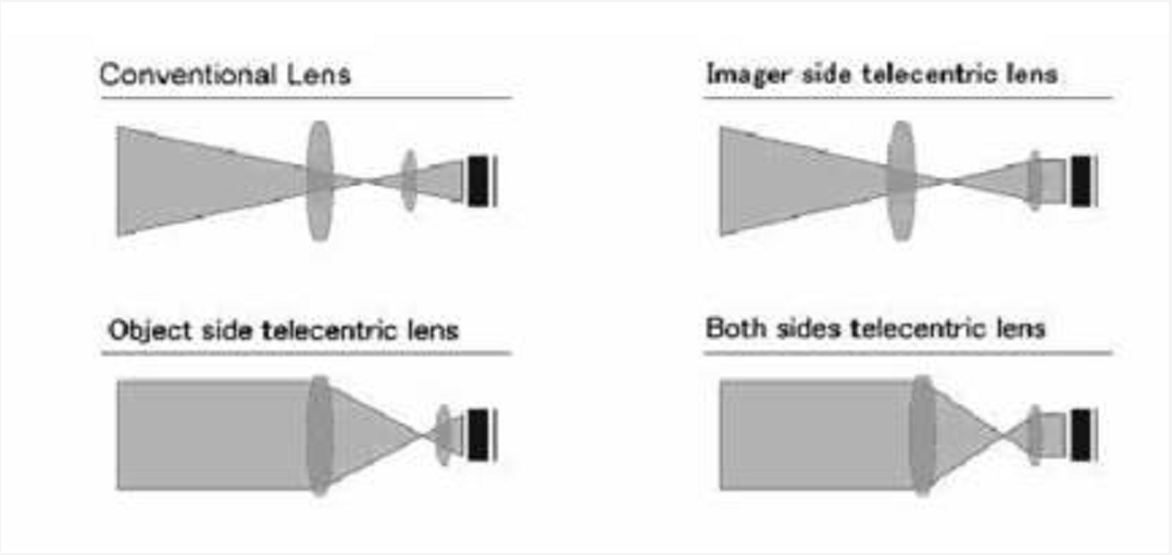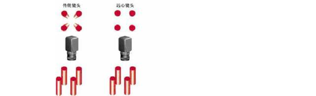 遠(yuǎn)心鏡頭是為糾正傳統(tǒng)鏡頭的視差而特殊設(shè)計(jì)的鏡頭,它可以在一定的物距范圍內(nèi),使得到的圖像放大倍率不會(huì)隨物距的變化而變化。遠(yuǎn)心鏡頭與傳統(tǒng)鏡頭對(duì)比,如圖: