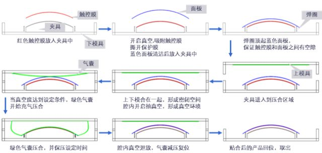 觸摸薄膜貼合主要分為貼合和脫泡兩個(gè)工藝過(guò)程,貼合主要起到定位、初步粘接作用,此過(guò)程中會(huì)存在一定的氣泡殘留在貼合面中;脫泡起到擠出氣泡、強(qiáng)化粘接效果的作用。隨著汽車電子的日益發(fā)展,汽車廠商正在把重點(diǎn)逐步轉(zhuǎn)向用戶體驗(yàn)和個(gè)性化需求的設(shè)計(jì)上,汽車人機(jī)操作界面開(kāi)始采用一體式和曲面式。操作面板有了一定的弧度,且面板內(nèi)有導(dǎo)柱、螺絲柱等凸點(diǎn),與傳統(tǒng)的平面擠壓貼合和滾壓貼合有差異,觸控面板貼合一般采用真空氣囊貼合,圖4為觸摸薄膜的貼合工藝過(guò)程。