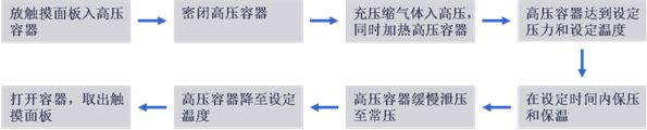 觸控膜放置在高壓、較高溫度的環(huán)境下,可以擠出膜片內(nèi)的氣體,以達(dá)到脫泡的目的。一般觸摸面板貼合后的氣泡小于2mm,再經(jīng)過(guò)脫泡機(jī)脫泡處理后,氣泡都可以消除;過(guò)大的氣泡需要先采用單點(diǎn)脫泡。脫泡過(guò)程如圖6所示。