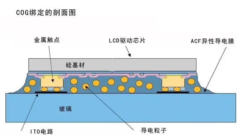 ACF由含有導(dǎo)電粒子的環(huán)氧樹脂(類似于UV紫外固化膠水)組成。導(dǎo)電粒子保證了驅(qū)動IC的金凸點和玻璃上的ITO導(dǎo)體之間的接觸。ACF膠的固定在芯片和液晶玻璃之間建立了必要的壓力,以確保凸點和液晶玻璃上的軌道之間的良好電氣連接。由于導(dǎo)體珠上的膠的表面張力,導(dǎo)電粒子之間不會有水平接觸,從而避免了驅(qū)動IC的相鄰金凸點之間的短路。