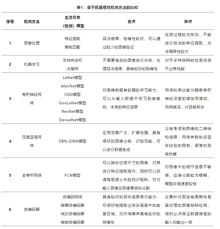 基于機器視覺的缺陷檢測方法的比較如表1所示,包括各種方法的主流分類(檢測)模型、優(yōu)缺點對比。