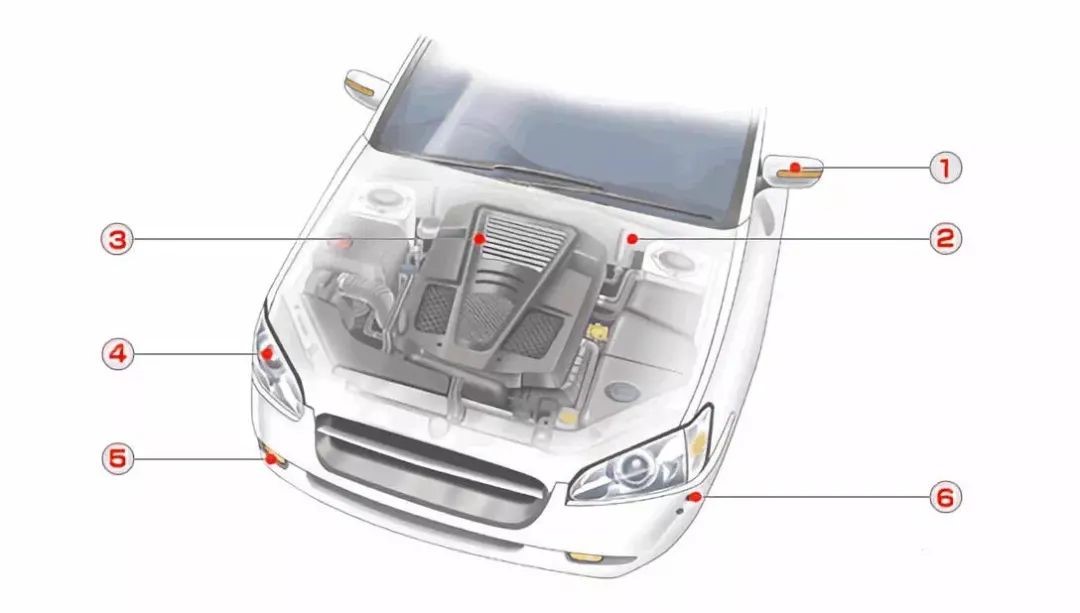① 車用閃光燈:防水、提高遮光性② 引擎蓋隔壁:隔熱、防噪音③引擎封條/電池封條:吸收震動(dòng)、防止物體碰撞噪音④ 汽車前燈:防水、提高遮光性⑤ 霧燈:防水、提高遮光性⑥ 邊角感應(yīng)器&邊角照相機(jī):防塵、防水