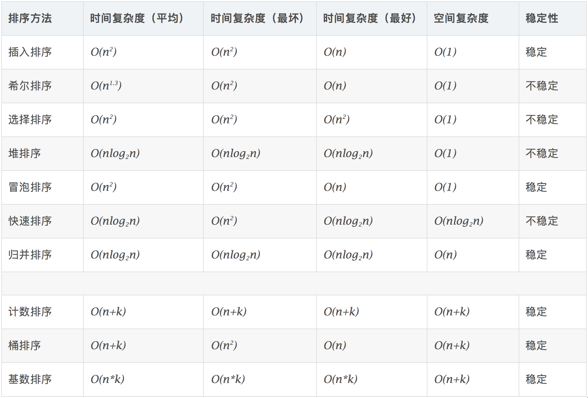 - 比較類排序:通過比較來決定元素間的相對(duì)次序,由于其時(shí)間復(fù)雜度不能突破O(nlogn),因此也稱為非線性時(shí)間比較類排序。
