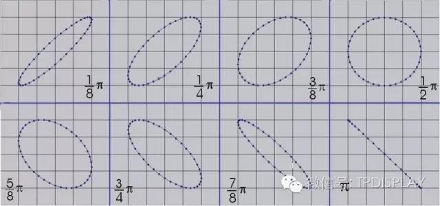 但是,如果O光與E光之間的位相差不是90度,則合成的光就會是不同橢園度的橢園偏振光(或者線偏振光)。下圖列出了幾種不同位相差時的情況。