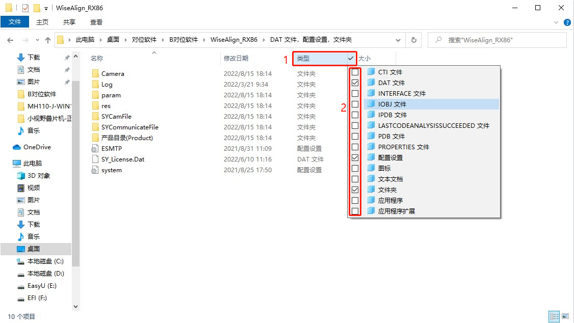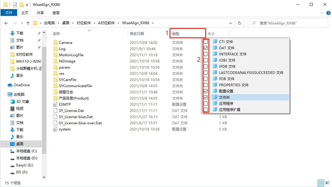 點開A對位軟件的文件夾所在位置,然后點擊下圖當中箭頭所指示處后,把2標記處當中的Dat文件、配置設置、文件夾全部打鉤,并把當前所保留的文件全部復制到B對位軟件的文件夾所在位置上。