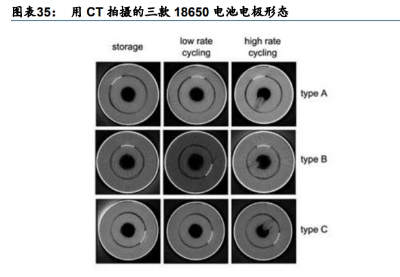 在能量密度方面,軟包電池具有優(yōu)勢。該維度上國內(nèi)領(lǐng)先的軟包電池有寧德時代、孚能科 技等,圓柱電池有力神、比克等,方形電池有寧德時代、億緯鋰能等。國內(nèi)外產(chǎn)品在能量 密度的差距上,圓柱、軟包電池較大,方形電池基本沒有差距,該維度上國外第一梯隊多 為日韓企業(yè),如 LG 化學(xué)、三星 SDI、松下、遠景動力等。 在循環(huán)壽命上,方形、軟包電池遠優(yōu)于圓柱電池。圓柱電池的壽命可靠性較低與內(nèi)阻較大、 散熱能力較弱有關(guān)。圓柱卷繞式電池在使用過程中的一種老化失效形式是卷繞極片發(fā)生翹 曲,翹曲發(fā)生的來源可能是電極各層在循環(huán)中的體積變化步調(diào)不一致。