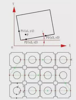 啟動自動尋邊功能后,切割頭從P點(diǎn)出發(fā),自動測得板料兩垂直邊上的3點(diǎn):P1、P2、P3,并據(jù)此自動計算出板料的傾斜角度A,以及板料的原點(diǎn)。