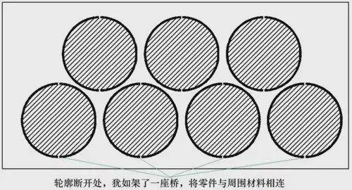 橋位將零件與周圍材料連在一起,成熟的編程軟件,可根據(jù)輪廓的長度,自動加上合適數(shù)量的橋位。還能區(qū)分內(nèi)外輪廓,決定是否加橋位,使不留橋位的內(nèi)輪廓(廢料)掉落,而留橋位的外輪廓(零件)與母材粘連在一起,不掉落,從而免去分揀的工作。