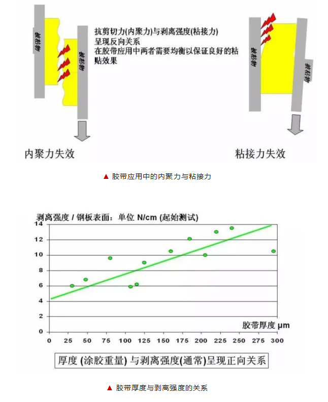 內(nèi)聚力是膠的內(nèi)部強(qiáng)度,即膠帶在應(yīng)用中的保持力(抗剪切力),相當(dāng)于粘貼表面平行的應(yīng)力作用,內(nèi)聚力高的膠帶普遍具有高耐溫性、較低的起始剝離強(qiáng)度和較高的最終剝離強(qiáng)度、膠的流動(dòng)性低、低初粘力等特點(diǎn)。