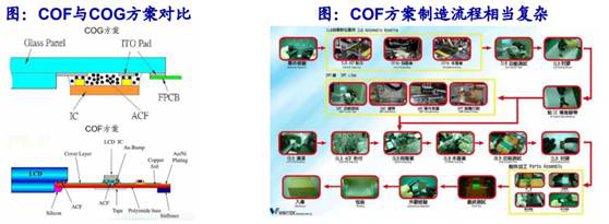 目前手機顯示主要采用COG技術進行驅動芯片的封裝。18:9顯示屏仍然可以采 用COG工藝,但是未來幾年隨著全面屏從18:9向19:9甚至20:9演進,COG將越發(fā)力不從心。而采用COF的全面屏,其下端邊框可能縮小至3.6mm的距離甚至更小,因此COF將滿足更高屏占比的需求。