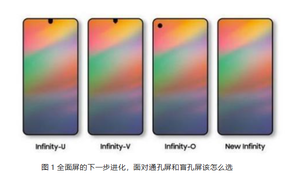 隨著智能顯示的飛速發(fā)展,消費(fèi)者對(duì)顯示設(shè)備顏值的追求越來(lái)越高。試想我們的手機(jī)屏幕點(diǎn)亮?xí)r是一塊顯示無(wú)死角的顯示屏那自然是極好的,所以偏執(zhí)的消費(fèi)者追求極致的的屏占比;屏下指紋技術(shù)及聽筒隱藏設(shè)計(jì)的出現(xiàn),讓全面屏技術(shù)日趨成熟,所以隱藏?cái)z像頭成為我們追求完美顯示的最后拼圖。從iphone X最早的劉海屏到夏普的美人尖,到OPPO水滴屏,再到三星和華為的打孔屏(通孔和盲孔),可謂百花齊放,百家爭(zhēng)鳴的全面屏?xí)r代。如下圖1所示:人們對(duì)于手機(jī)顯示的探索腳步從未停止過。截止目前來(lái)看,打孔實(shí)現(xiàn)對(duì)前置攝像頭的安放,可以進(jìn)一步提升手機(jī)正面顯示區(qū)域的利用面積,可能是目前為止來(lái)說較為合理的方案。