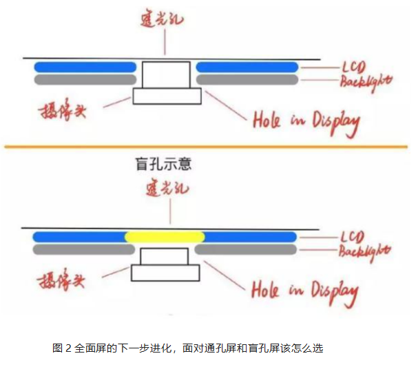 打孔方案通俗來(lái)說就是在屏幕上開了孔,分為通孔和盲孔兩種打孔方式;眾所周知,手機(jī)的一塊屏幕有多層結(jié)構(gòu)。通孔的解決方案是在屏幕的保護(hù)玻璃下,所有的層都穿孔(除了最外面的蓋板玻璃),讓前置攝像頭穿過液晶層以及背光模組嵌入孔洞中,而盲孔則是保留了液晶和蓋板不打孔。(如下圖2示意圖);
