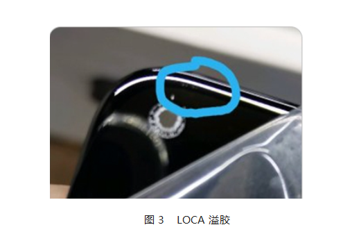 1、選用LOCA即采用水膠的方式,由于LOCA的流動(dòng)性使其具備很高的填充性能,能夠很好的填充偏光片的圓孔。但同時(shí)也存在溢膠問題,如果溢膠到偏光片邊緣會(huì)造成折射率存在偏差,會(huì)引起較為明顯的顯示缺陷,如圖3,因此LOCA方案不可行。