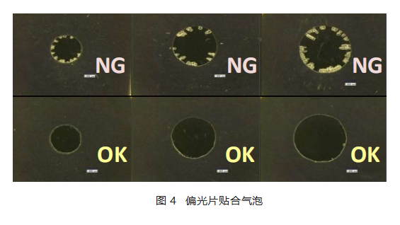 2、所以各大屏廠工程師轉(zhuǎn)換方向依靠全貼合OCA解決。起初的全貼合OCA由于填充性能不足(填充段差30%),導(dǎo)致偏光片邊緣出現(xiàn)圖4的邊緣氣泡,一直無(wú)法解決。
