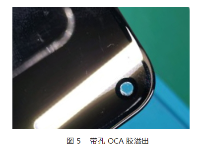 4、在普通全貼合OCA上先模切成帶孔OCA,然后和打孔的偏光片精準(zhǔn)對(duì)位完成全貼合,這個(gè)很考驗(yàn)貼合精度,對(duì)貼合工藝要求很高,而且脫泡后OCA膠很容易從邊緣溢出來(lái)。如圖5所示: