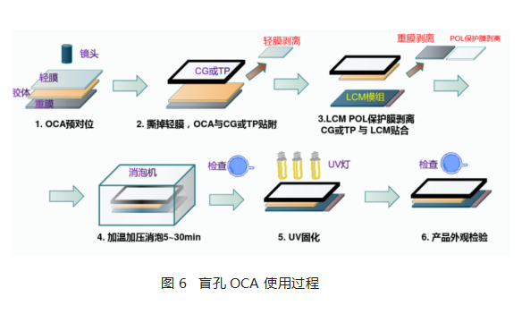 這種樹脂具備常溫下普通全貼合OCA的性能,能很好的完成分切,模切等加工,不會(huì)影響尺寸穩(wěn)定性,一旦完成貼合后在加熱加壓的條件下具備很好的流動(dòng)性,可以很好的填充偏光片的圓孔,照射UV后具備很好的信賴性,盲孔OCA使用過程如下圖6所示: