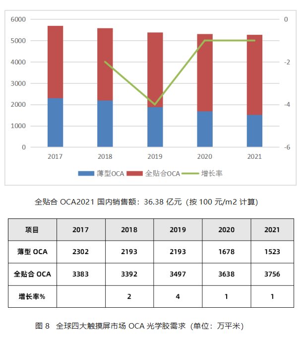 根據(jù)研究機(jī)構(gòu)于2019年的調(diào)研數(shù)據(jù),2018年全球四大觸摸屏市場(chǎng)(智能手機(jī)、平板電腦、筆記本電腦及車載顯示市場(chǎng),不包括返修市場(chǎng),下同)OCA光學(xué)膠需求量為5586萬(wàn)平米,預(yù)計(jì)到2021年,全球四大觸摸屏市場(chǎng)OCA光學(xué)膠需求量為5279萬(wàn)平米,復(fù)合增長(zhǎng)率為-1.8%,整體市場(chǎng)呈下滑趨勢(shì),但市場(chǎng)用量仍然巨大。