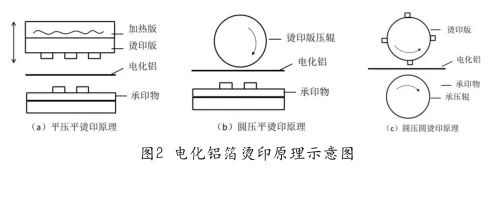 電化鋁燙印的原理就是將燙印版安裝在版臺(tái)上并對(duì)其進(jìn)行加熱到一定溫度,使熱熔性的有機(jī)硅樹脂隔離層和膠黏層受熱熔化,片基層和染色層的黏附力大大降低,從而使轉(zhuǎn)印層(指染色層、鍍鋁層、膠黏層)與片基脫離,膠黏層受熱后粘附力增強(qiáng),將帶有色料的鍍鋁層轉(zhuǎn)印到承印物表面。電化鋁燙印的方法有壓燙法和滾燙法兩種,其燙印原理可分為平壓平燙印、圓壓平燙印和圓壓圓燙印,其燙印原理如圖2所示。