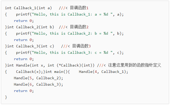 如上述代碼:可以看到,Handle()函數里面的參數是一個指針,在main()函數里調用Handle()函數的時候,給它傳入了函數Callback_1()/Callback_2()/Callback_3()的函數名,這時候的函數名就是對應函數的指針,也就是說,回調函數其實就是函數指針的一種用法。