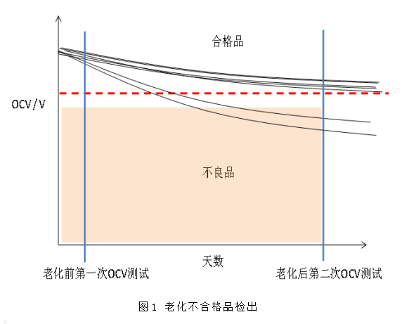 極片上的顆?;蛭⒘拷饘贇堅?、隔膜上的微小缺陷、電芯在組裝過程中引入的粉塵等,都會造成電芯內部微短路。對于微短路電芯,僅通過容量及一次電壓是無法完成篩選的,因此必須引入K值測試:通過精確計算其電壓降速率來判斷電芯是否存在微短路情況,如圖1所示。