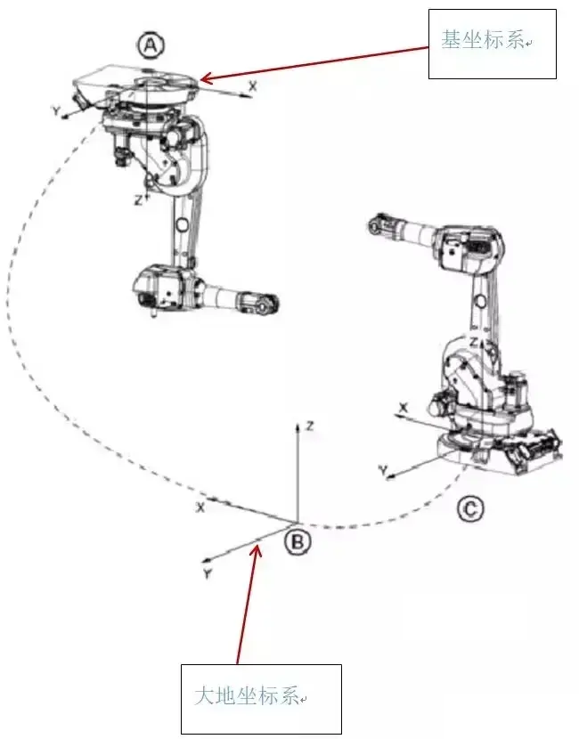 大地坐標(biāo)系:大地坐標(biāo)系是以大地作為參考的直角坐標(biāo)系。在多個(gè)機(jī)器人聯(lián)動(dòng)的和帶有外軸的機(jī)器人會(huì)用到,90%的大地坐標(biāo)系與基坐標(biāo)系是重合的。但是在以下兩種情況大地坐標(biāo)系與基坐標(biāo)系不重合:
