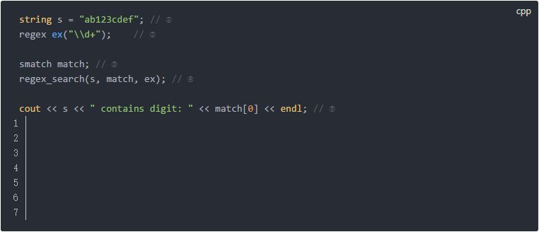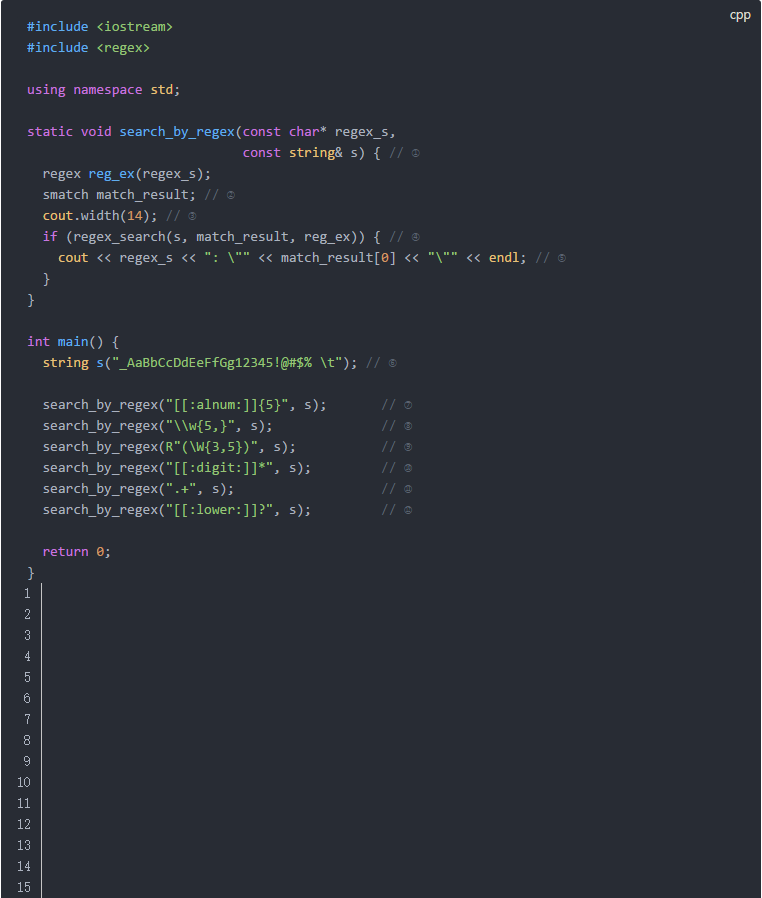 match_result用來存儲(chǔ)查找的結(jié)果。regex_search在字符串中查找匹配字符。[[:alnum:]]{5}是指:字符或者數(shù)字出現(xiàn)5次。\\w{5,}是指:字母,數(shù)字或者下劃線出現(xiàn)5次或更多次。R"(\W{3,5})"是指:非字母,數(shù)字或者下劃線出現(xiàn)3次到5次。[[:digit:]]*是指:數(shù)字出現(xiàn)任意多次。.+是指:任意字符出現(xiàn)至少1次。[[:lower:]]?是指:小寫字母出現(xiàn)0次或者1次。該程序輸出如下: