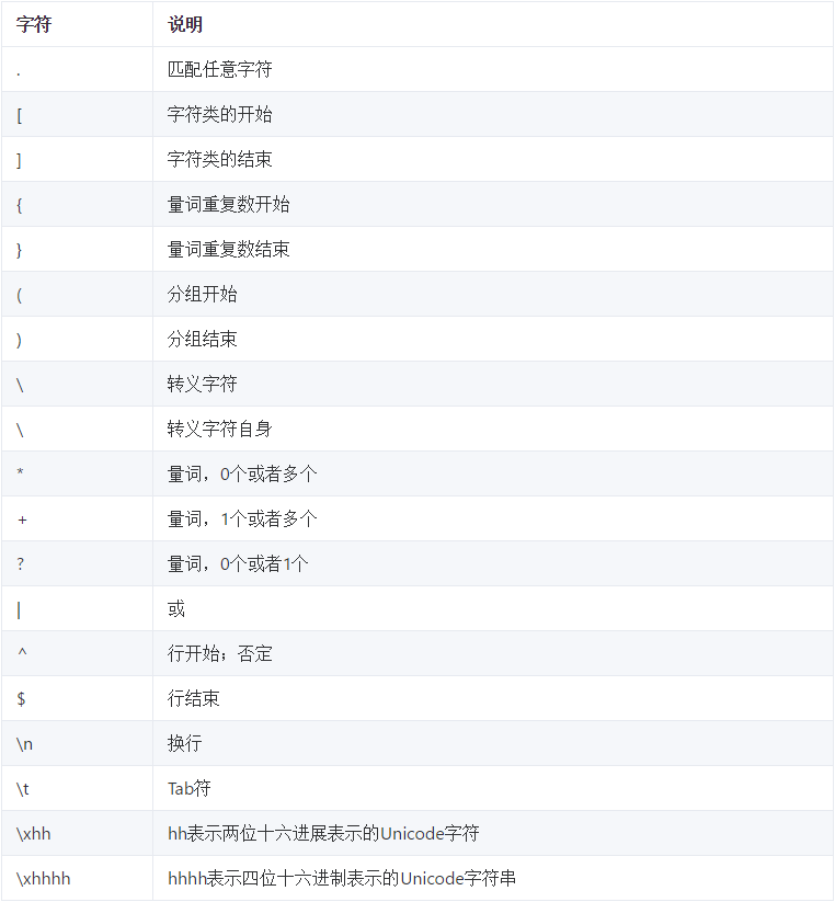正則表達(dá)式本身定義了一些特殊的字符,這些字符有著特殊的含義。它們?nèi)缦卤硭尽?/p>