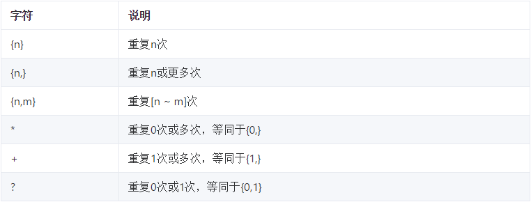 下面就是在正則表達(dá)式中描述重復(fù)的方式。它們通常跟在字符類的后面,描述該字符出現(xiàn)多次。