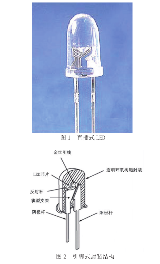 LED 的封裝形式多種多樣,圖 1 為直插式 LED 封裝形式。本文將以直插式紅光 LED 為例介紹 LED 的封裝流程。直插式 LED封裝又稱 Lamp-LED 封裝 ,引腳式封裝。引腳式封裝采用引線架作為各種封裝外型 ,如直徑為 5 mm 的圓柱型(簡(jiǎn)稱 Φ5)封裝的引腳,圖 2 為引腳式封裝結(jié)構(gòu)。