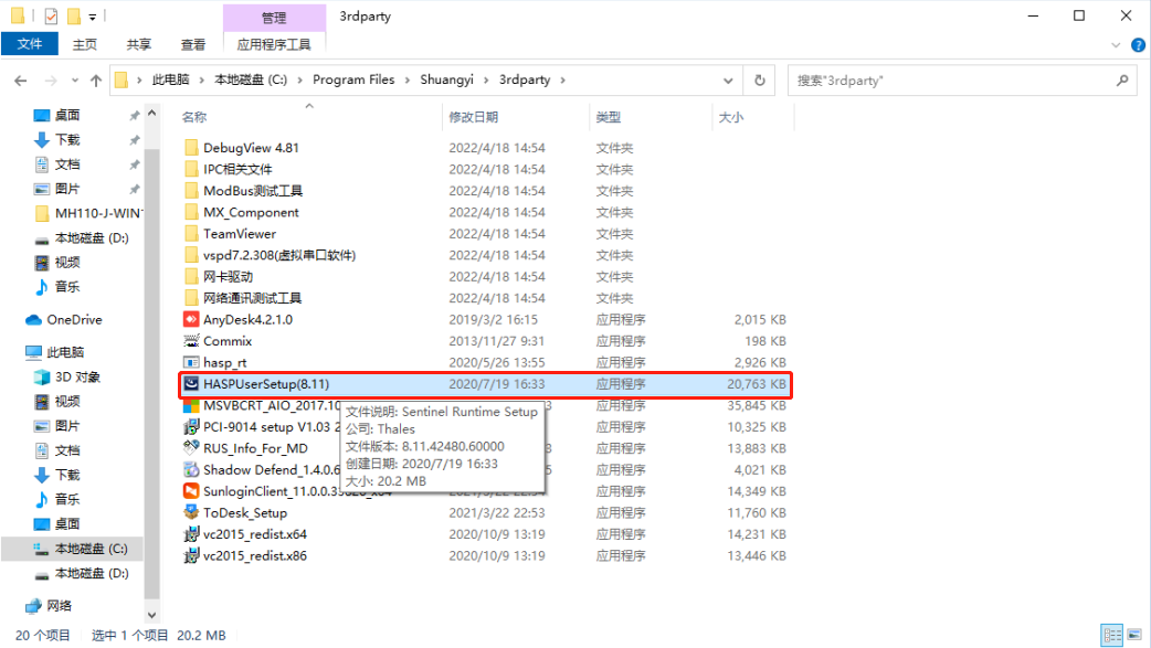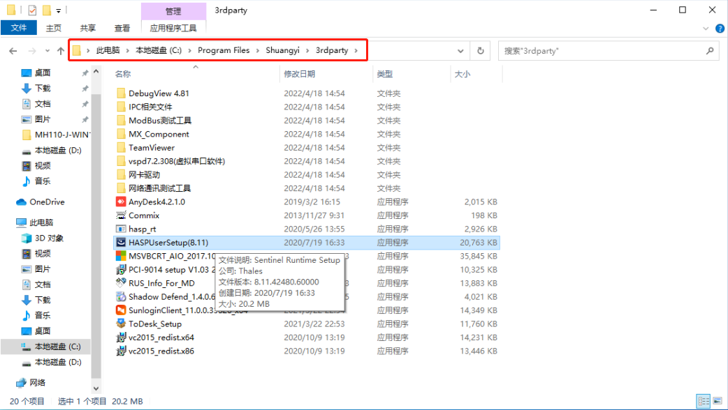 2. 通過“此電腦-本地磁盤C-Program Files-Shuangyi-3rdparty”路徑,找到“HASPUserSetup(8.11)”文件