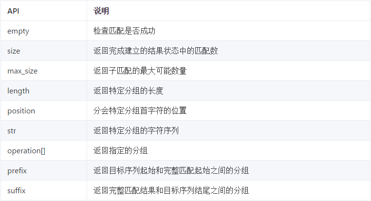這些分組最終可以在匹配完成之后,可以通過std::match_results的API來獲取。這些API如下表所示:
