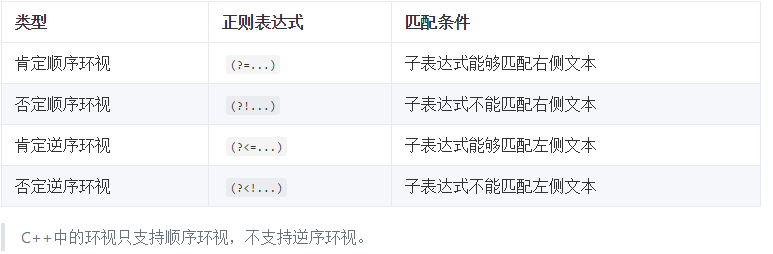 環(huán)視是對匹配位置的附加條件,只有條件滿足時才能完成匹配。環(huán)視有:順序(向右),逆序(向左),肯定和否定一共四種: