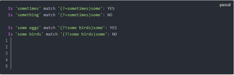 對于包含環(huán)視的正則表達(dá)式來說,環(huán)視之外的內(nèi)容是匹配的主體,環(huán)視本身只是一個附件條件。(?=sometimes)這個肯定順序環(huán)視要求從這個位置開始,接下來的字符串必須是"sometimes"才能完成匹配。(?!some birds)這個否定順序環(huán)視要是接下來的字符串一定不能是"some birds"才能完成匹配。
