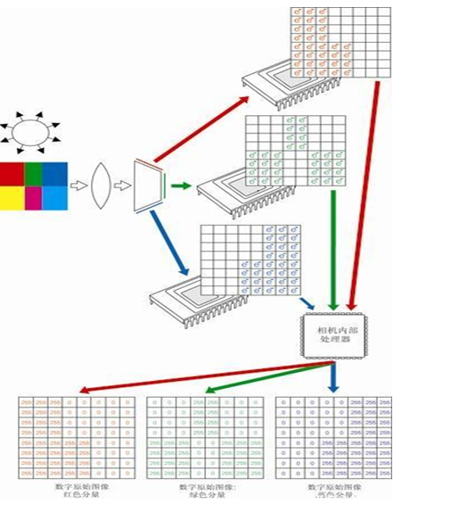 在這種情況下,如果我們希望使用 CCD 作為相機感光芯片,并輸出紅、綠、藍三色分量,就可以采用一個分光棱鏡和三個 CCD,如右圖所示。棱鏡將光線中的紅、綠、藍三個基本色分開,使其分別投射在一個 CCD 上。這樣以來,每個 CCD 就只對一種基本色分量感光。
