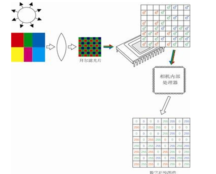 CCD 芯片按比例將一定數(shù)量的光子轉(zhuǎn)換為一定數(shù)量的電子,但光子的波長,也就是光線的顏色,卻沒有在這一過程中被轉(zhuǎn)換為任何形式的電信號,因此 CCD 實際上是無法區(qū)分顏色的。