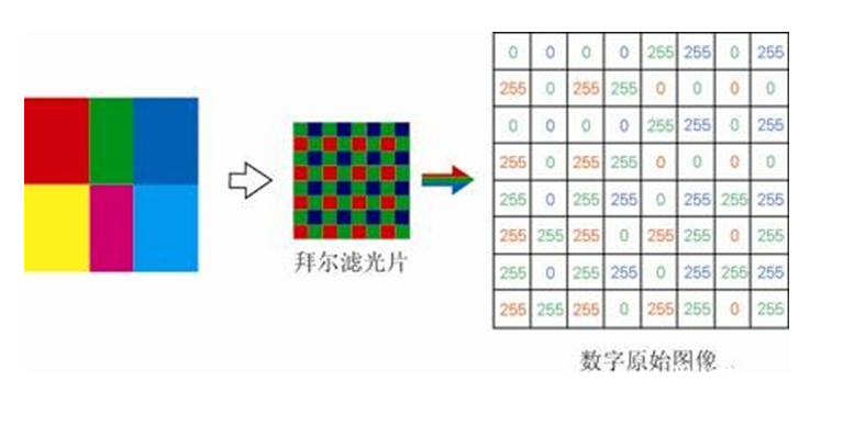 如果在 CCD 表面覆蓋一個只含紅綠藍三色的馬賽克濾鏡,再加上對其輸出信號的處理算法,就可以實現(xiàn)一個 CCD 輸出彩色圖像數(shù)字信號。由于這個設(shè)計理念最初由拜爾(Bayer)先生提出,所以這種濾鏡也被稱作拜爾濾鏡。