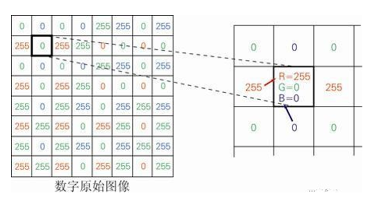 在源圖像中該點實際是紅色的,但經(jīng)拜爾濾鏡中綠色鏡片過濾后,該點色值為零。我們只需要把臨近紅藍像素中的紅色與藍色值復制到該像素中,就能獲得其RGB值(255,0,0)。