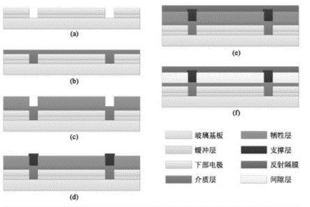 圖2 IMOD器件TFT-LCD兼容的背板工藝制作流程。(a)圖案化后的緩沖層和下部電極層;(b)沉積介質(zhì)層;(c)圖案化后的犧牲層;(d)圖案化后的支撐層;(e)沉積反射隔膜層;(f)剝離犧牲層。