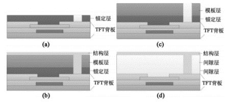 在3種MEMS加工工藝中,由于體硅微機械加工工藝需要雙面光刻機及鍵合技術等,LIGA工藝需要X-Ray曝光機,因而不能與TFT-LCD工藝兼容。而表面微機械加工工藝簡單,易于與TFT-LCD工藝兼容,因而得到廣泛應用。本文所介紹的基于MEMS輔助的顯示工藝,皆以表面微機械加工工藝為基礎。