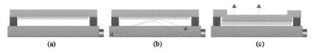 圖6 不同狀態(tài)下的TMOS像素。(a)像素關,背光關;(b)像素關,背光開;(c)像素開,背光開。