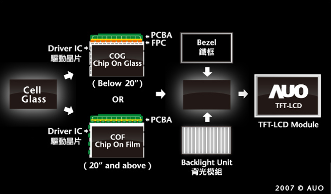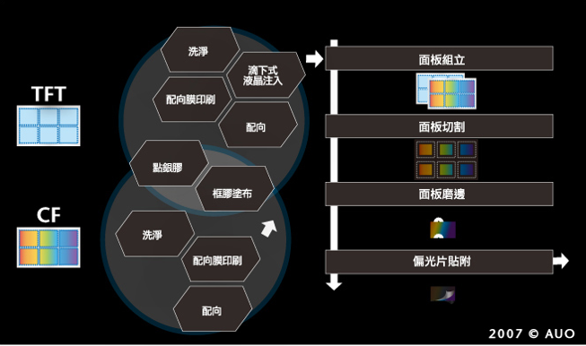 后段模組的組裝制程則是將Cell制程之后的玻璃和其他的如電路、外框、背光板等等多種零組件組裝生產(chǎn)的作業(yè)。