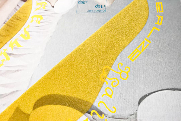 將五彩繽紛的添加劑彩蔥粉與印刷油墨(通常是與UV油墨)結合使用,在印刷油墨未干燥時,在其表面鋪上彩蔥粉,干燥后形成顆粒狀的彩蔥效果。