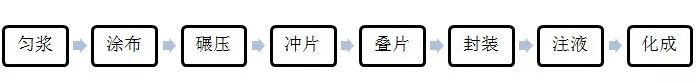 鋰離子電池生產(chǎn)過(guò)程較為復(fù)雜,以萬(wàn)向一二三為例,主要包括:勻漿、涂布、碾壓、沖片、疊片、封裝、注液、化成幾個(gè)工序。如下圖所示。