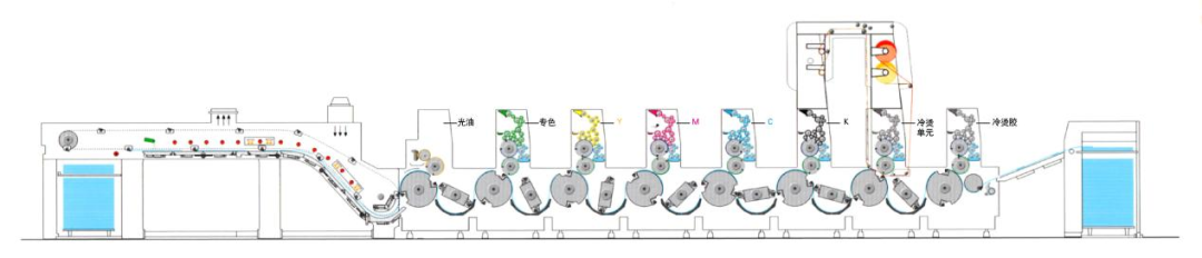 如在前面印刷完未完全干透的4色墨上(中間座4色后僅有一支UV燈管進行預(yù)固化)再印刷冷燙膠黏劑,因膠黏劑的黏度一般很大,膠黏劑是否會反拉前面的色墨、經(jīng)過冷燙座壓印時整體墨層是否會被反拉破壞、冷燙箔剝離是否完整、冷燙膠黏劑的透明性是否會對4色圖案的透底產(chǎn)生影響等情況都未知。